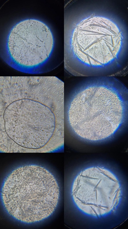 З кожної суміші нанесли краплю на предметне скельце і під мікроскопом розглянули стан білків після зсідання, охарактеризували його. Порівняли ступінь однорідності суміші і розмір грудочок згорнутого білка.