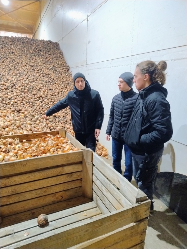 Головний агроном-технолог комбінату Артем МАЛАНЮК детально ознайомив з овочесховищем, представленим двома холодильними камерами з активним вентилюванням для зберігання насипом цибулі ріпчастої холодним способом та камери для зберігання картоплі і коренеплодів (буряк столовий, морква) та цибулі солодких сортів (червона, біла) у контейнерах та ящиках.