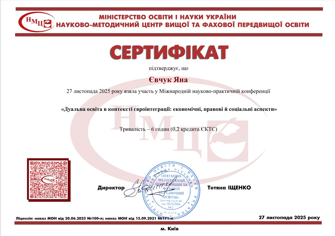 Участь у конференції сприяла поглибленню професійних компетентностей, ознайомленню з кращими вітчизняними та міжнародними практиками та налагодженню фахових контактів із фахівцями, які мають успішний досвід реалізації дуальних освітніх моделей у закладах фахової передвищої та вищої освіти. Захід вирізнявся високим науково-методичним рівнем, насиченою змістовною програмою та ефективною організацією, що дало змогу учасникам отримати актуальні знання, налагодити професійний діалог та глибше зануритися в сучасні тенденції розвитку дуальної освіти.