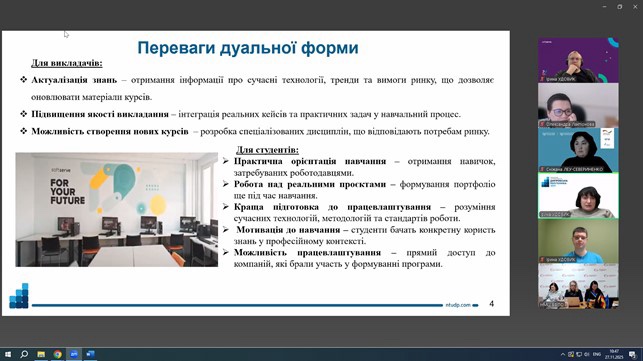 Впродовж роботи конференції було представлено широкий тематичний спектр доповідей, присвячених сучасним концепціям розвитку дуальної форми здобуття освіти, інноваційним підходам до організації освітнього процесу та узагальненню міжнародних практик інтеграції теоретичної підготовки здобувачів з їхньою практичною діяльністю на виробництві. Значну увагу учасники зосередили на питаннях формування сталого партнерства між закладами освіти й роботодавцями, удосконаленні механізмів забезпечення якості освітніх програм, ролі наставництва в системі професійної підготовки та інструментах оцінювання результатів навчання в умовах дуальної освіти.
