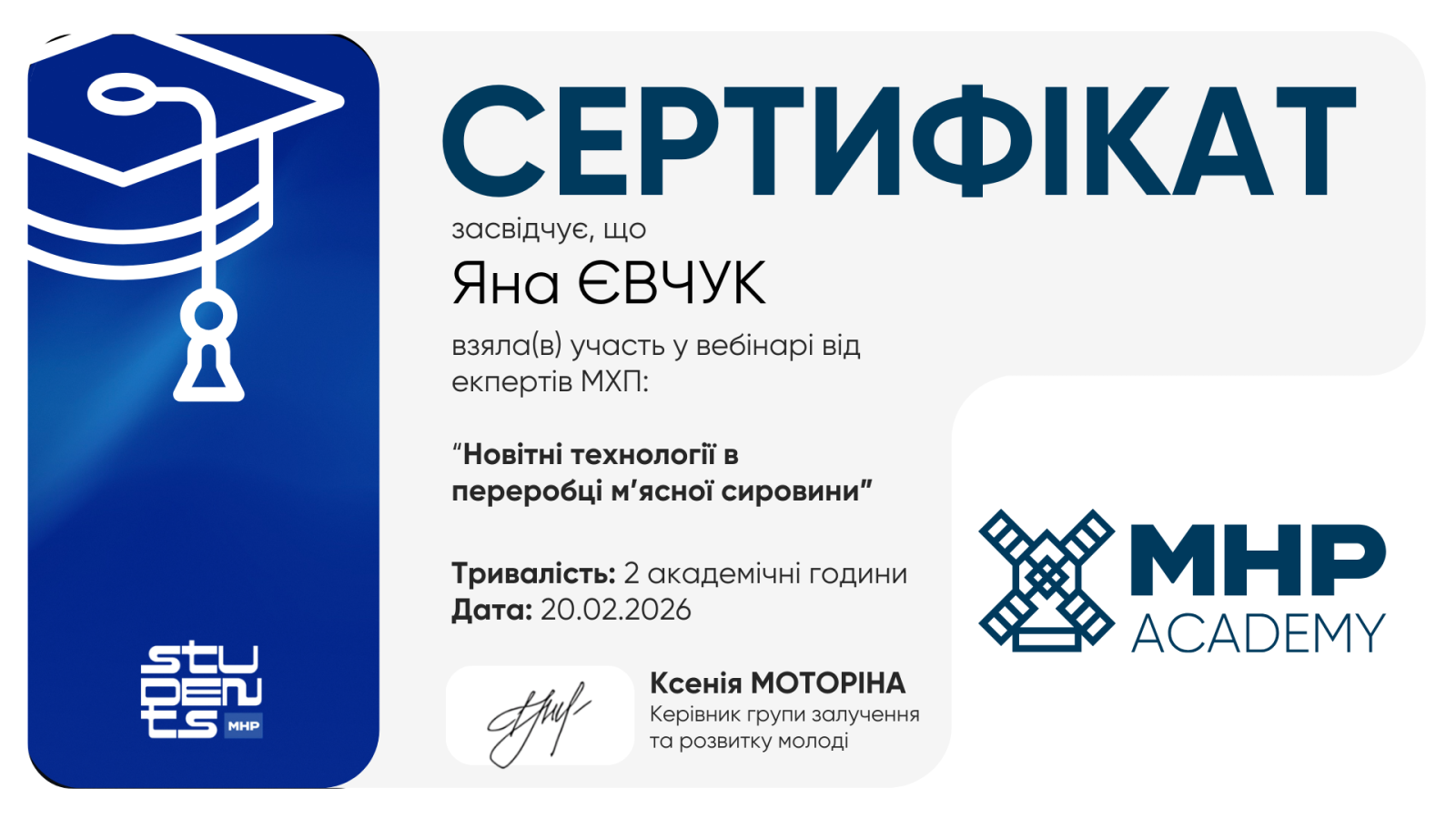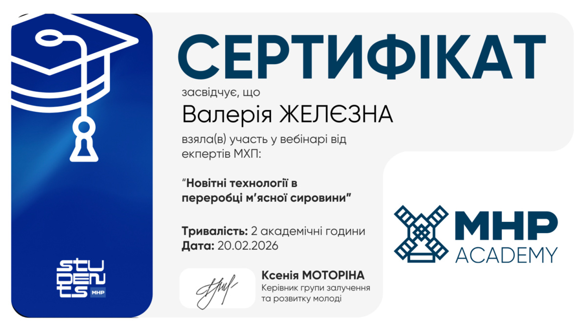 З метою підвищення професійної компетентності та ознайомлення з актуальними тенденціями розвитку харчової промисловості доценти кафедри харчових технологій Володимир НОВІКОВ, Валерія ЖЕЛЄЗНА та Яна ЄВЧУК взяли участь у науково-практичному семінарі «Новітні технології в переробці м’ясної сировини», який було проведено провідними фахівцями компанії ПрАТ «МХП» – одного з найбільших та найінноваційніших агропромислових холдингів України.
