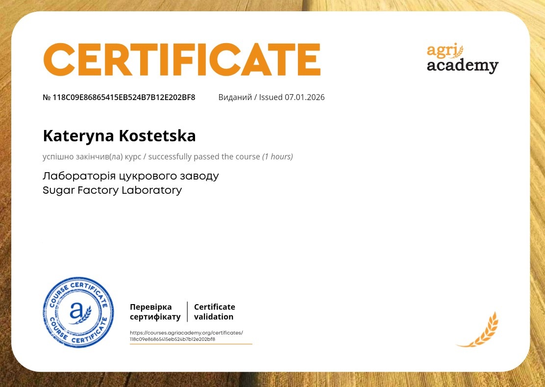 - курс / successfully passed the course (1 hours) Лабораторія цукрового заводу Sugar Factory Laboratory (сертифікат № 118c09e86865415eb524b7b12e202bf8 від 07.01.2026).