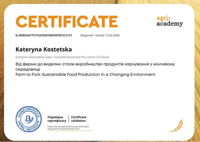 - курс / successfully passed the course (12 hours) Від ферми до виделки: стале виробництво продуктів харчування у мінливому середовищі Farm to Fork: Sustainable Food Production in a Changing Environment (сертифікат № bdee4af7577247ea878603efb72c21cf від 13.02.2026);