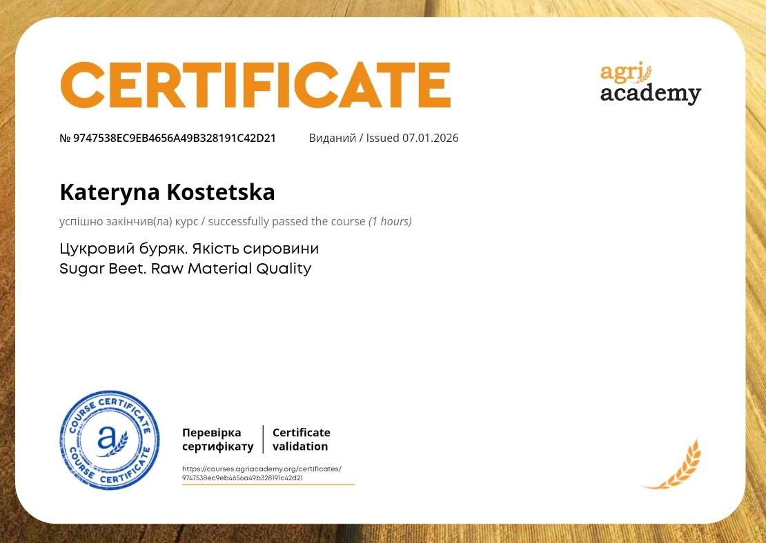 - курс / successfully passed the course (1 hours) Цукровий буряк. Якість сировини Sugar Beet. Raw Material Quality (сертифікат № № 9747538ec9eb4656a49b328191c42d21 від 07.01.2026);