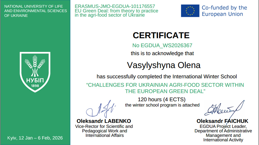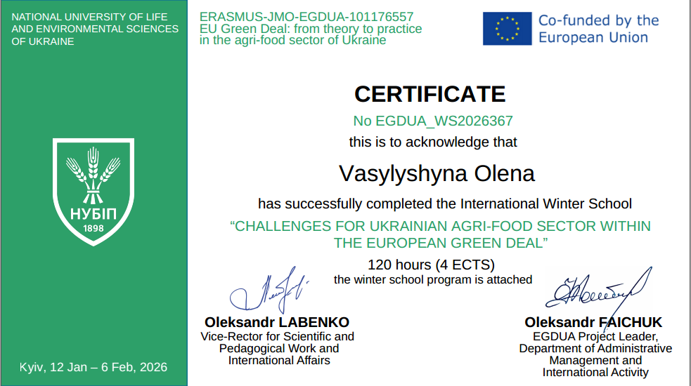 Розвиток сучасного освітнього простору та інтеграція України до європейської наукової спільноти зумовлюють необхідність постійного вдосконалення професійних компетентностей викладачів. З 12 січня по 6 лютого 2026 року професор кафедри харчових технологій Олена ВАСИЛИШИНА взяла участь у роботі Міжнародної зимової школи «Виклики для агропродовольчого сектору України в рамках реалізації Європейського зеленого курсу». Захід відбувся за підтримки Програми Європейського Союзу Erasmus+ (напрям Jean Monnet). Організатором зимової школи виступав НУБіП України у співпраці з Лейбніц-Інститутом аграрного розвитку в країнах з перехідною економікою (Німеччина) і Латвійським університетом наук про життя та технологій (Латвія).